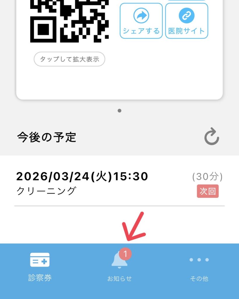 アプリを開くと、一番下の真ん中【お知らせ】の横にも数字が表示されているのでお知らせを開きます。